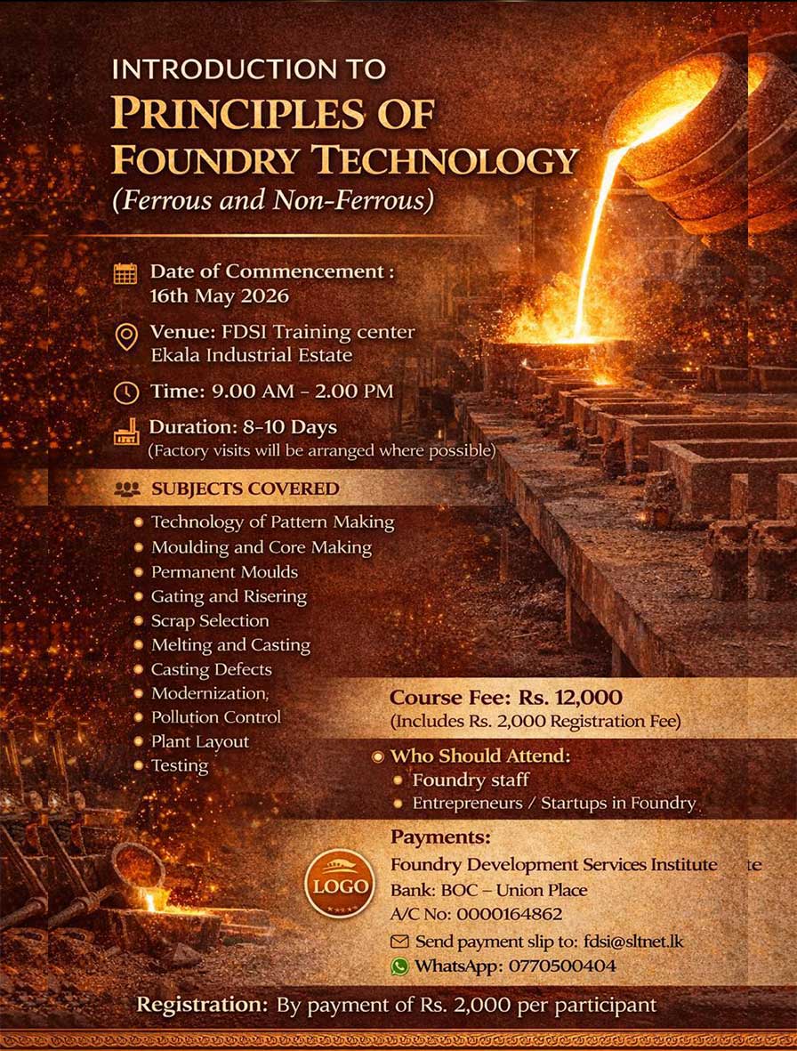 There will be public lectuer at IESL auditoriam. by Melvin Samarasinghe Chairman FDSIOn 27th May at 5.15 pmOpen to Industries Subjects coveredIntroduction to Foundry Technolgy Industry 4 Fou...